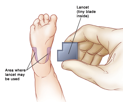 A doctor uses a tiny blade (lancet) to take a drop of blood from your baby’s foot. The blood is put on a small test strip. This measures the sugar in the drop of blood.