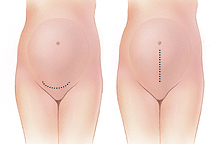 Pregnant abdomen showing low transverse incision. Pregnant abdomen showing midline vertical incision.