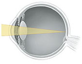 Cross section of eye showing light focusing in front of retina.