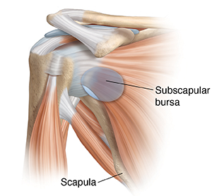 The subscapularis muscle is a large muscle across the front of the shoulder blade. The subscapular bursa is found between the subscapularis muscle and the chest wall. Inflammation of this bursa is called subscapular bursitis.