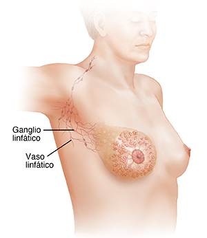 El linfedema puede producirse después del cáncer de mama cuando se realiza la cirugía para extirpar los ganglios linfáticos y vasos de debajo del brazo. O puede ocurrir cuando la axila la zona se trata con radioterapia. Estos tratamientos dañan la axila (axilar) ganglios linfáticos y los vasos linfáticos cercanos. Esto interrumpe el flujo normal de la linfa en el mano, brazo, axilas, pecho, cuello y mama. Así pues, en lugar de que la linfa fluya por su sistema linfático y de vuelta a los vasos sanguíneos como debería, el líquido se acumula en la piel y los tejidos. Esto provoca hinchazón. Los cambios en el flujo linfático también mantienen que la linfa se filtre como debería. Esto puede aumentar el riesgo de infecciones. Puede interferir en la cicatrización de las heridas en las zonas afectadas.
